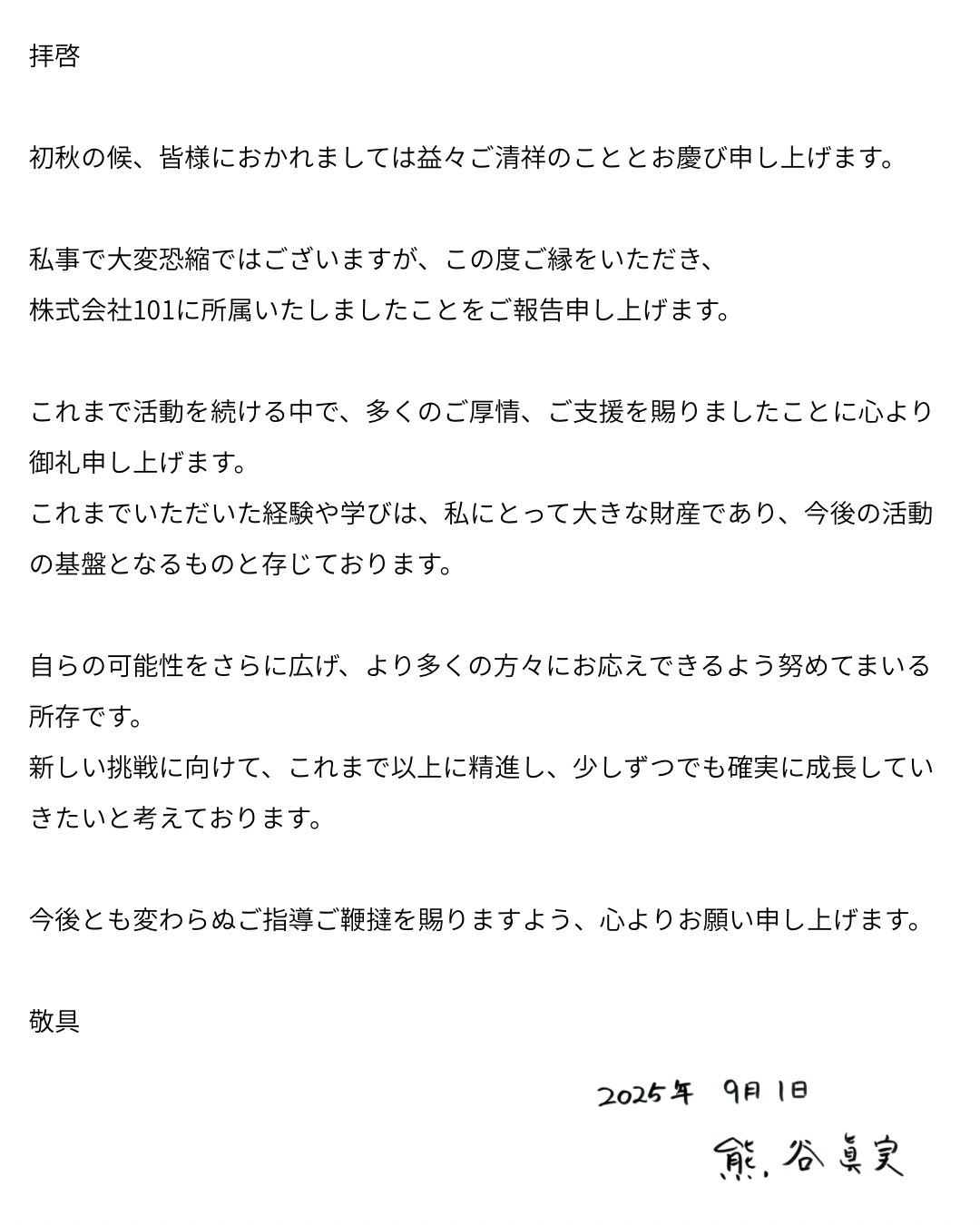 2025年9月より俳優・タレントとして活躍している熊谷真実と弊社がマネージメント契約をいたしましたことを報告します。今後、ご依頼につきましては株式会社101へお問合せください。